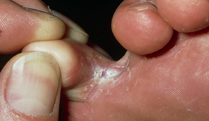 ათლეტის ფეხი ყველაზე ხშირად ვითარდება ტერფის ქვედა ნაწილში ფეხის თითებს შორის.