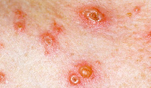 მას ახასიათებს წითელი გამონაყარი, ქავილით, რომელიც შემდეგ გარდაიქმნება სითხით სავსე წყლულად. საბოლოოდ წარმოქმნის ქერცლს და ჩამოიფრცქვნება.